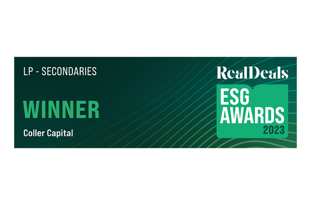 Coller Capital won an ESG award at the 2023 Real Deals ESG Awards ceremony. We won the inaugural award for best in secondaries for ESG with the judging panel looking for evidence of a commitment to best practice notably the steps adopted to support underlying managers.